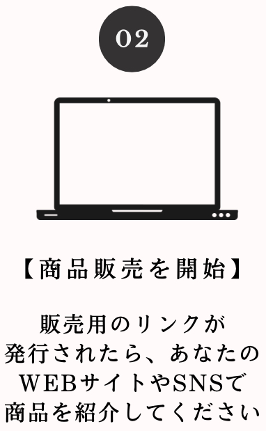商品販売リンクは、あなたのブログ、WEBサイト、SNS、YouTubeチャンネルなど、オンラインのあらゆるプラットフォームで使用可能です。リンクを効果的に活用して、幅広いユーザーに紹介してください。